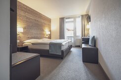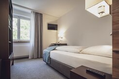 Doppelzimmer mit Badezimmer, welches Dusche oder Badewanne und WC inkludiert. Die Bettengrösse beträgt zwei Betten à 90x200cm.