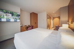 Im Executive 3-Bett-Zimmer hat es gemütlich Platz für bis zu drei Personen. Die dritte Person übernachtet in einem Zusatzbett. Die Zimmer verfügen über ein Boxspringbett (2 Matratzen à 100x200cm oder 1 Matratze à 200*200cm). Das Bad ist mit eine Badewanne und Dusche ausgestattet. Zimmer mit Verbindungstüren sind verfügbar. -
