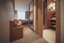 Die Junior Suite ist das perfekte Familienzimmer für bis zu vier Personen. Auf 38 Quadratmetern finden die Kinder Platz zum Austoben und die Eltern einen Ort der Erholung. Im separaten Wohnraum, getrennt durch eine Tür, können bis zu zwei Kinder auf einem Sofabett schlafen. Die Zimmer verfügen über ein Boxspringbett (2 Matratzen à 90x200cm). Das Bad ist mit Badewanne und/oder Dusche ausgestattet. Mit Balkon oder Terrasse sind es die idealen Räumlichkeiten für entspannte Familienferien. -