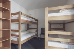The four- and five-bed rooms have bunk beds and storage areas. Sufficient daylight is provided by the floor-to-ceiling windows and, in some rooms, a sunny balcony. Bed linen is provided for the stay, terry towels are brought by the guests themselves.