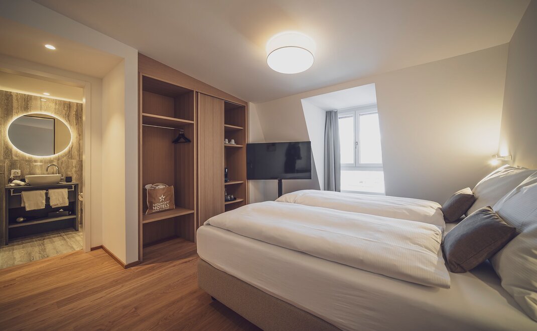 With 19 to 25 square meters of living space, the rooms in this category promise plenty of space and comfort. The rooms are furnished with a double bed (2 mattresses 90 x 200cm), a chair with table and a bathroom with shower and WC. Some of the more spacious double rooms have a balcony. Exclusive Soeder toiletries are also available in the bathroon.